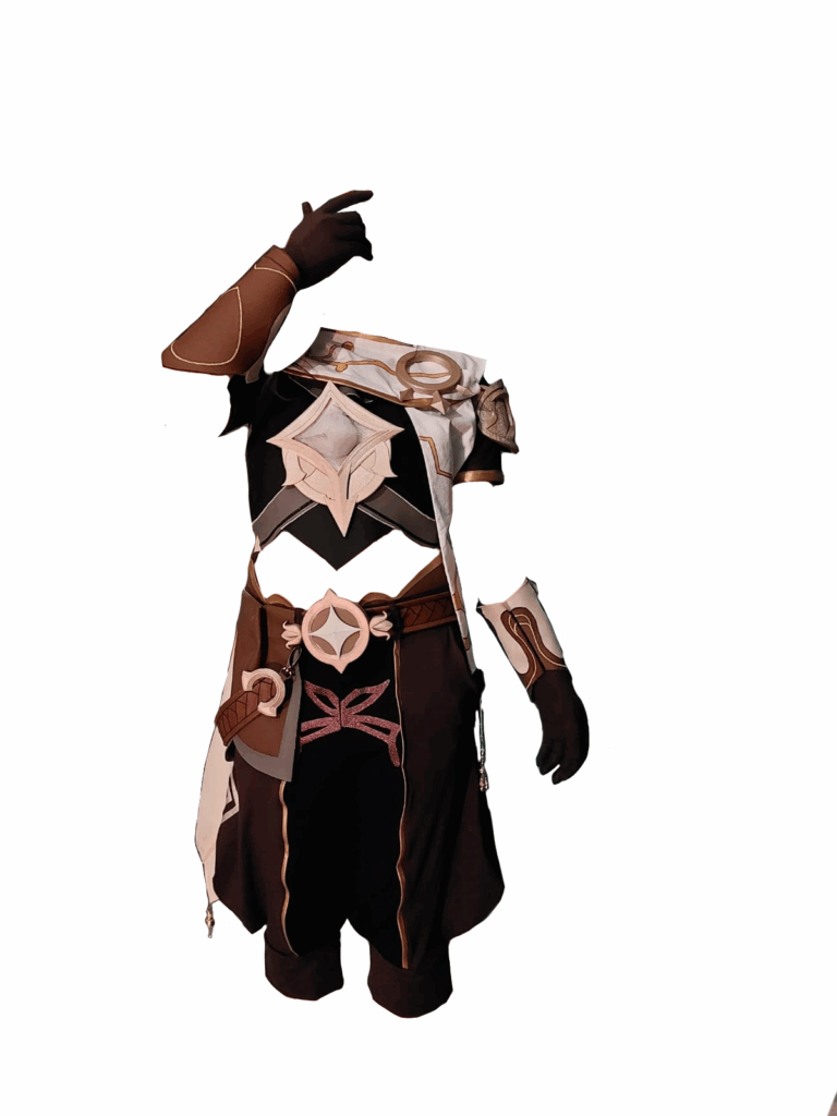 Le tissu principal de ce costume un jersey en deux teintes de marron différentes, il est aussi composé de plusieurs simili cuirs différents. La cape est en coton blanc