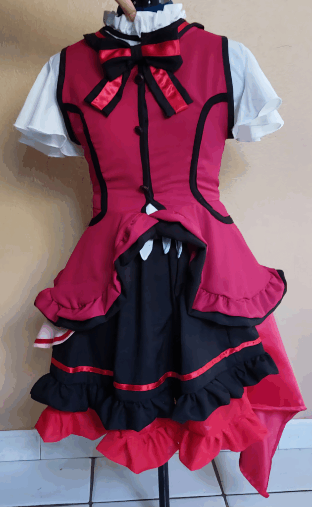 – la jupe : elle est en deux couches, la couche du dessus en crêpe noir avec un froufrou en bas et un détail de ruban rouge surpiqué, la couche du dessous un peu plus longue en voile rouge aussi terminée d’un froufrou