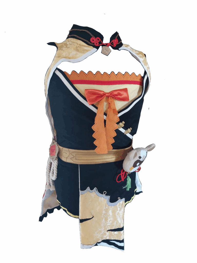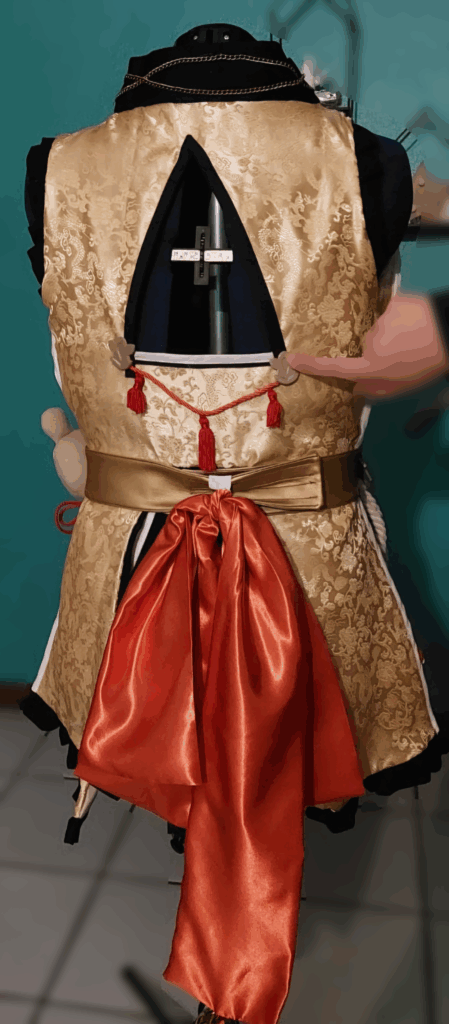 Pour ce costume j’ai réalisé un certain travail dans le choix des matières, notamment dans les tissus principaux. J’ai décidé de sélectionner un brocart chinois avec un motif de dragons, en référence à la région dont Xiangling est issue (Liyue : région inspirée de la chine, dont le dieu est un dragon) et pour compenser ce tissu fragile j’ai utilisé un coton fin mais tout de même rigide pour la doublure. Ensuite pour le confort de la personne à qui ce costume était destiné j’ai choisi un jersey pour les parties au contact de la peau (haut, shorts..).
