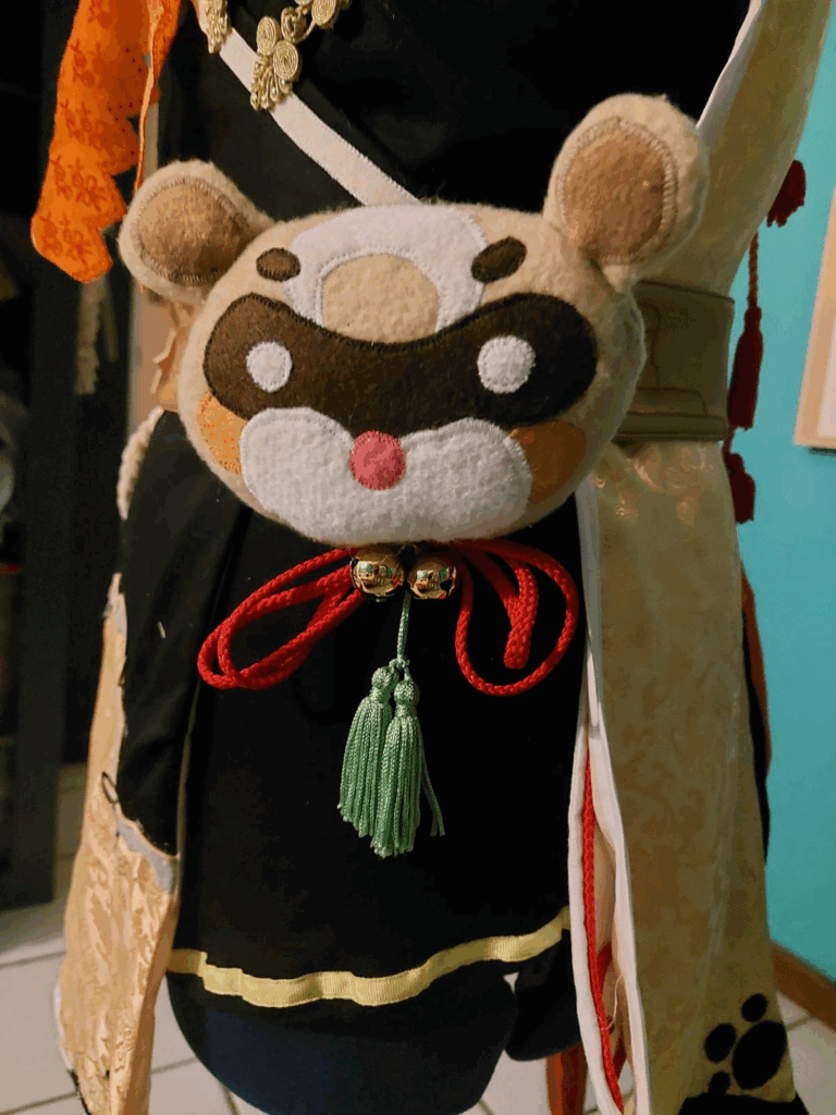 – la peluche à sa ceinture : réalisée à l’aide d’un plaid et de diverses feutrines assemblées avec un point de bourdon, elle est attachée à l’aide d’une pression en métal (cousue)